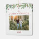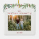 This Christmas ornament features trendy hand-drawn winter greenery along the top with a clean white background. Personalize with your family name, photo, and date.