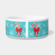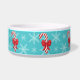 Festive and cute red and white cartoon illustration of Christmas candy canes with beautiful red bows. The background colour is blue with a light snowflake pattern. There is also a customizable text area for the name of the pet.
