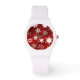A cute watch for the holidays in white with a cheery face in snowflakes on red.