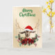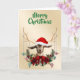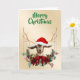 Cute Toggenburg kid goat with his Santa hat and antlers adorned with striped Christmas ornaments, this is my Tawny, surrounded by a holiday wreath of red poinsettias , pine cones, greenery and a big red bow. - original artwork ©goatlady GetYerGoat™