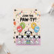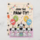 The reverse side of this fun dalmatian birthday invitation displays multiple dalmatian puppies wearing party hats with colourful balloons featuring paw prints and bone designs, topped with "JOIN THE PAW-TY!" text and festive bunting. Each dalmatian birthday invitation is fully customizable - personalize the child's name, age, date, time, location, and RSVP information to create the perfect party invitation.