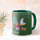 The pups glide gracefully in front of beautifully adorned Christmas trees, set against a serene traditional Christmas green background that radiates festive cheer. With its two-tone design and customizable option to add your name or a personal message, this mug is the perfect blend of practicality and seasonal delight.