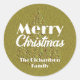 This is a captivating and festive Christmas sticker that adds a touch of personal charm to your holiday greetings. The sticker features a radiant embossed Christmas tree, adorned with vibrant ornaments that sparkle against a golden backdrop. Above the tree, the timeless greeting "Merry Christmas" is elegantly inscribed, adding a classic touch to the design. What makes this sticker truly special is the ability to personalize it with your family's name, transforming it into a unique keepsake.