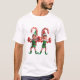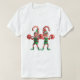 This playful design features two cheerful elves in traditional red and green outfits, engaging in a festive barbell challenge with candy cane bars and ornament weights. The symmetrical composition highlights the strength and holiday spirit of these whimsical characters, making it a perfect addition to any holiday-themed apparel or merchandise. The vibrant colours and fun concept are sure to catch the eye and spread joy during the Christmas season.