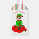 Hand drawn whimsical festive cartoon elf sitting on Santa's gift bag full of toys. Green, red and white Christmas gift tag.