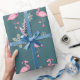 A playful Christmas pattern featuring pink flamingos dressed in scarves, Santa hats, and boots, surrounded by delicate snowflakes on a teal background. Perfect for quirky holiday decor!