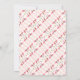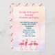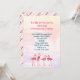 Festive flamingos holiday party invitation with a tropical theme. Fill in the simple template areas for a party title - including names of the host / hosts. Background palm trees image adds to the tropical theme with four wreath-wearing pink flamingos at the bottom of vertical cards. Reverse has a flamingo pattern. Changing the size may cut off part of the design.