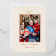 Simple and sweet, this Christmas holiday photo card features handwriting style fonts and modern simple bow graphic in shiny metallic foil to celebrate the season in on-trend and modern style. Your portrait orientation photo is framed by a thin red line over seasonal greeting and family name text with space for a longer, in-depth message of cheer on the back.