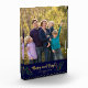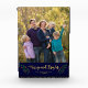 Vertical Holiday Photo Block featuring the words "Merry and Bright" in a stylish script in faux gold surrounded by festive leaves and berries against a blue background. Check out other holiday items here https://www.zazzle.com/collections/holiday_christmas_new_year_cards-119015800351034065?rf=238364477188679314