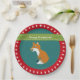 Add a festive touch to any table with these customizable paper plates. They feature a cute illustration of a fox with a Christmas ornament in his mouth set against a dark teal background dotted with white snowflakes. The plates have a festive red and white border. The message on the green ribbon stripe can be personalized with your own text.
