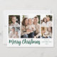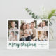 Modern holiday photo card featuring your favorite 5 photos arranged in a collage layout. Your custom greeting is featured in an elegant green script with your family name and the year displayed to the right. The card reverses to display a green and white snowflake pattern.