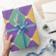A vibrant harlequin-style pattern featuring alternating purple, green, and gold diamonds connected by small beige dots. This bold and lively design adds a sense of celebration and energy.
