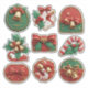 A collection of beautifully designed Christmas cookies featuring holly, bells, bows, and candy canes.