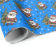 Cute blue festive wrapping paper with a pattern of fun cartoon Santas and Christmas trees. Santa is dressed in his red and white outfit and he is holding a lit lantern, Next to him is a green fir tree decorated with baubles and a yellow star. Ideal to wrap those holiday gifts.