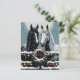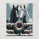 Pretty Christmas craft paper for scrapbooking with the graphics of a white horse and a black horse standing at a wooden gat decorated in holiday wreathes and pretty twinkling Christmas lights covered in snow. These horses are done in a cartoon comic book pop art style to invoke a nostalgic feeling.