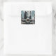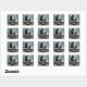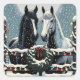 Pretty Christmas stickers with the graphics of a white horse and a black horse standing at a wooden gat decorated in holiday wreathes and pretty twinkling Christmas lights covered in snow. These horses are done in a cartoon comic book pop art style to invoke a nostalgic feeling.