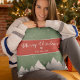 Add a personal touch to your family Christmas with this cute custom last name throw pillow. Throw pillow features a festive green background with white snowflakes and snowy winter trees. Across the background is a red ribbon with the editable text Merry Christmas, a heart, and your family name. This throw pillow adds a warm seasonal touch to your home and also makes a great personalized housewarming, birthday, bridal shower, wedding, Christmas, or other holiday gift.
