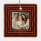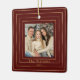 Modern design features a multi-gold frame against a bold Christmas red background. Easily personalize with name, year, and monogram (on back). Perfect gift and keepsake for the holiday season.