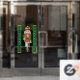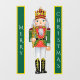 A traditional nutcracker figure flanked by two vertical green banners with the words "Merry Christmas" written in yellow. The nutcracker is dressed in a colourful uniform with a crown, adding a classic holiday touch to the entrance.