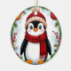 A festive cartoon penguin wearing a red santa hat and scarf surrounded by colourful Christmas decorations, evoking warmth and holiday cheer with a merry and joyful winter celebration.
