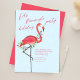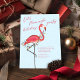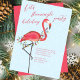 This design features a Christmas party invitation with a festive funny cute, elegant watercolor, at the beach, with tropical Florida, pink flamingo, perfect island ocean, holiday party design, with let's flamingle, fun whimsical saying.