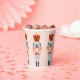 This paper cup features a repeating pastel nutcracker with a red hat on a blush pink background. Colours include red, blue, navy, pink and white.