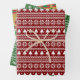 Set of 3 colourful, festive Christmas wrapping paper sheets. Red with a pattern of white snowflakes and Christmas trees, kelly green with a pattern of snowflakes and gold foil with stacks of green, red and white Christmas presents.
