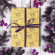This festive yellow holiday gift wrap is covered in wishes of peace, love, and joy in jolly purple typography.