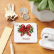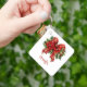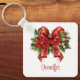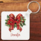 Personalized keychain with a festive Christmas bow in red and gold. Surrounded by poinsettia flowers, pine and Christmas decorations.