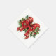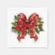 Paper napkins with a festive Christmas bow in red and gold. Surrounded by poinsettia flowers, pine and Christmas decorations.