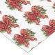 A table runner with a festive Christmas bow in red and gold. Surrounded by poinsettia flowers, pine and Christmas decorations.