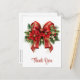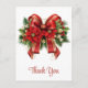 Thank You postcard with a festive Christmas Bow in Red and Gold. Surrounded by poinsettia flowers, pine and Christmas decorations.