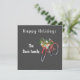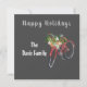 Festive holiday design features red bicycle watercolor illustration with a basket full of Winter greenery and seasonal decorations. Customizable greeting and personalization in very light gray font on chalkboard gray background.