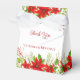 This beautiful Christmas floral favour box features traditional poinsettia flowers, holly berries and greenery creating a beautiful botanical border. Festive and bright boxes with red script for a holiday wedding with elegant script.