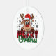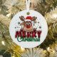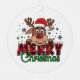 At the centre of the ornament, a friendly cartoon reindeer, adorned with a Santa hat, peeks over a sign that joyfully exclaims "Merry Christmas." The reindeer's big smile and twinkling eyes reflect the joy and excitement of the holiday season, infusing your heart with warmth and merriment.