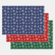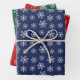 A pattern of white snowflakes on festive red, green and navy blue backgrounds.