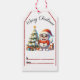 This whimsical Christmas tag showcases a cheerful snowman beside a decorated tree and colourful gifts, perfect for adding a joyful touch to holiday presents.