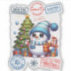 A charming snowman in a cozy blue hat and scarf enjoys a warm drink beside a beautifully decorated Christmas tree. Surrounded by colourful presents and various festive stamps, this delightful scene radiates holiday joy and cheer.
