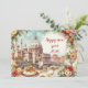 Welcome the New Year 2026 with a festive italian atmosphere. This greeting card features the phrase "happy new year 2026" written in elegant red cursive font. The background showcases a detailed illustration of St. Peter's Basilica in Vatican City, set against a picturesque cityscape. In the foreground, a beautifully arranged table displays candles, a cake, wine glasses, and floral arrangements, creating a celebratory ambiance. The card is adorned with colorful flowers and fruits, enhancing the joyful and festive theme.. YOU CAN CHANGE THE TITLE.