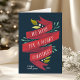 Elegant folded holiday cards for your business feature "we wish you a merry Christmas" in hand lettered typography on a red watercolor ribbon accented with red and green leaves and white berries. Personalize with your name or company name and the year in white on a navy blue background, and add a custom pre-printed message to the inside, along with your business logo.
