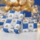 Festive Blue and White Typography Christmas Tree Family Photo Wrapping Paper. Blue and white background with snowflakes and a simple Christmas tree. White Merry, Happy, Jolly typography. Personalize the design with your photo - insert it into the template and make your own personal wrapping paper.