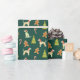 a Christmas-themed wrapping paper with a repeating pattern. The pattern consists of several elements, including whippets wearing red Santa hats and red scarves, green Christmas trees decorated with red ornaments, gingerbread men, and candy canes. The background colour of the wrapping paper is dark green, which contrasts nicely with the colourful elements. The design is festive and whimsical, making it suitable for wrapping Christmas gifts, especially for dog lovers or those who appreciate a playful holiday theme.