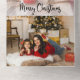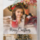 Colourful and festive sprays of Autumn leaves and winter greenery & berries with custom calligraphy Merry Christmas greeting and curved photo template with editable text fields.