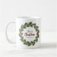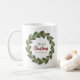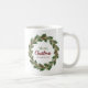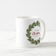 This simple and stylish Christmas mug features a beautiful wreath with green leaves, red holly berries and brown chestnut, pine cone. In addition, a green and red script typography with different styles that says "Merry Christmas and Happy New Year" on a white background