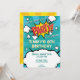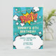 Invitation de la fête avec une typographie de style bande dessinée de "PARTY !". Cela inclut des éléments de bleu, d'orange, de jaune et de rouge, des explosions de bandes dessinées, des étoiles, et des arrière - plans d'étoiles éclatées.