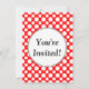 Un modèle d'invitation à la naissance ou au baby shower personnalisé avec des pois blancs simples grands et petits sur un arrière - plan rouge. Cliquez sur Customiser pour modifier les polices, les couleurs arrière - plans et bien plus encore, enregistrez votre conception pour plus tard.