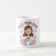 Illustration mignonne et réconfortante d'une maman souriante tenant une tasse de café, avec "Best Mom Ever" écrit en écriture joyeuse dessinée à la main sur elle. Entouré de coeurs roses doux, de fleurs et de soleil.
