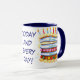 Une tasse blanche de bonne qualité avec jante et poignée bleu foncé. Le design peint à la main est un gâteau de Fête des pères et un rappel que chaque jour est "Fête des pères". Voir aussi carte de voeux et vêtements correspondants. Lave-vaisselle et micro-ondes.