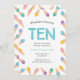 Faites une fête de 10e anniversaire de crème glacée pour votre petit! Cette adorable invitation à l'anniversaire comporte une glace couleur arc-en-ciel colorée aquarelle qui est mignon et parfait pour un anniversaire d'été. Tous les détails, y compris (sauf l'âge), sont personnalisables. (Autres âges et couleurs disponibles dans cette collection, voir ci-dessous) © Mini Moi Prints
