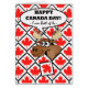 Un orignal se brise à travers un mur de tuiles en feuille d'érable sur la couverture de cette carte de voeux de la fête du Canada. Bonne fête du Canada ! De Two of Us, texte sur la couverture. Design contemporain audacieux en rouge, blanc, noir et marron. Copyright © Shoaff Ballanger Studios.